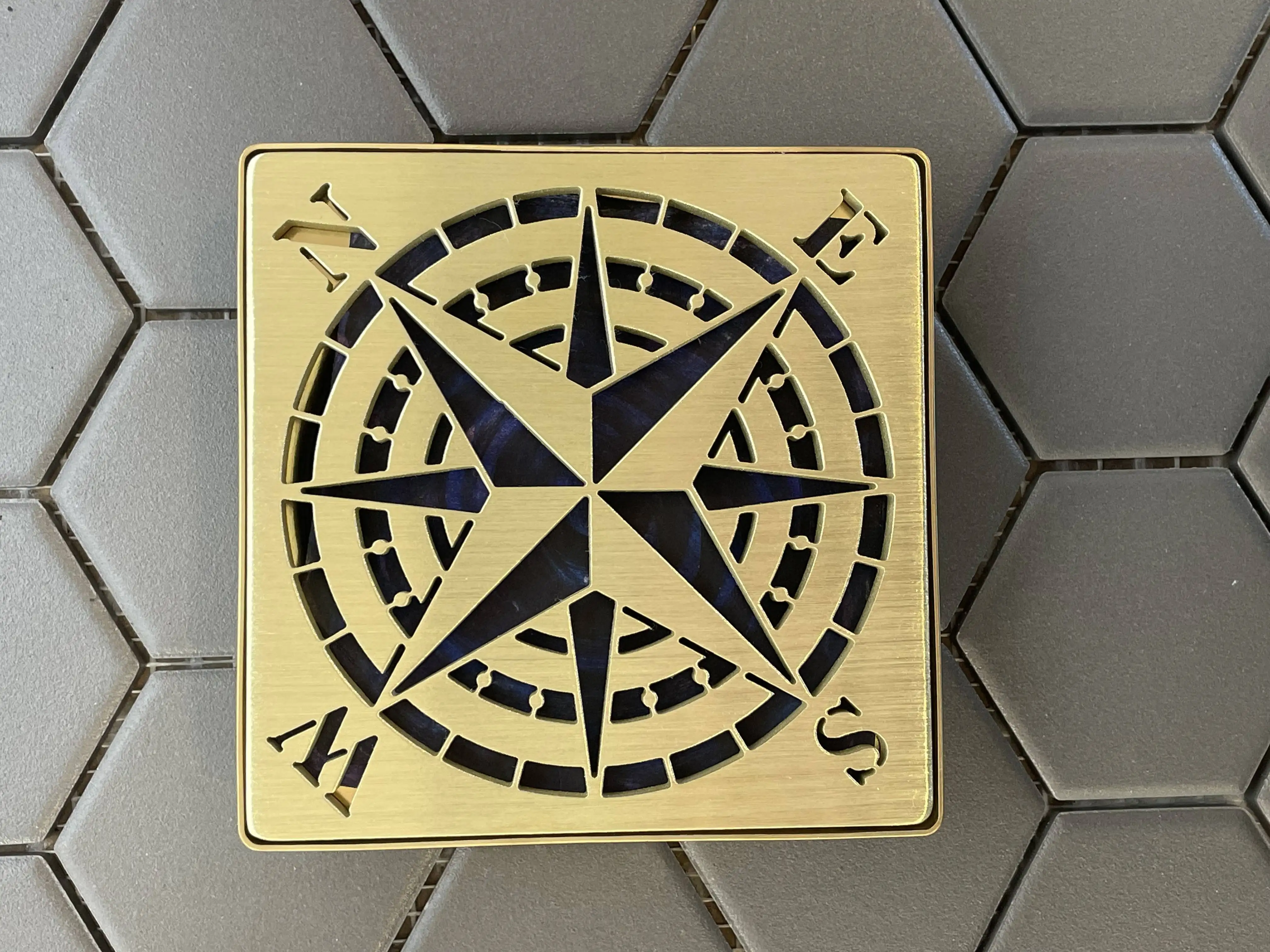 Bring a touch of nautical elegance to your bathroom with the Compass Rose Shower Drain from Designer Drains. This striking shower drain features a beautifully intricate compass rose design, symbolizing direction and adventure, perfect for those who love to infuse their spaces with unique and meaningful details.