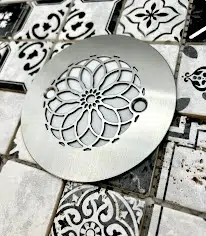Decorative 4.25 inch round shower drain cover with Mandala design