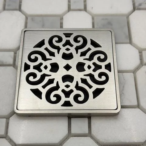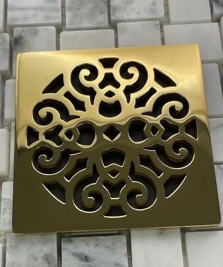 Upgrade your shower with the Classic Scrolls No. 4 Square Drain Cover, made to replace all Wedi square drain covers. This design adds a rich, classic look that works well in many bathroom styles. Each cover is made in Southern California from reclaimed 304 stainless steel, giving you a strong, rust‑proof, long‑lasting product.