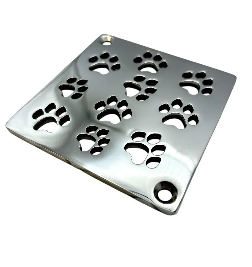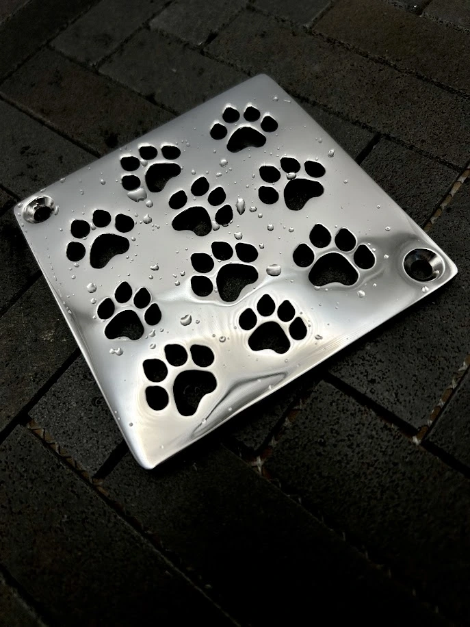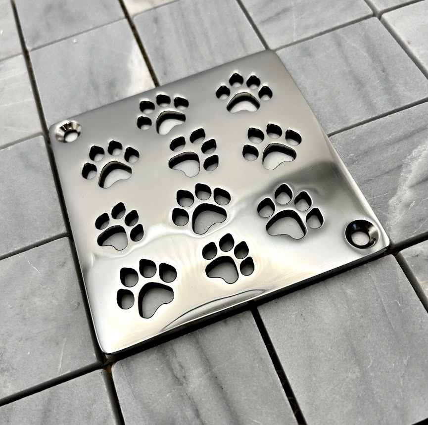 Add a playful and luxurious touch to your shower with the Dog Paws Square Shower Drain Cover by Designer Drains. Crafted from reclaimed 304 stainless steel in the USA, this durable replacement fits Schluter®-Kerdi square drains perfectly. Designed for easy DIY installation, it’s eco-friendly, stylish, and made to last.