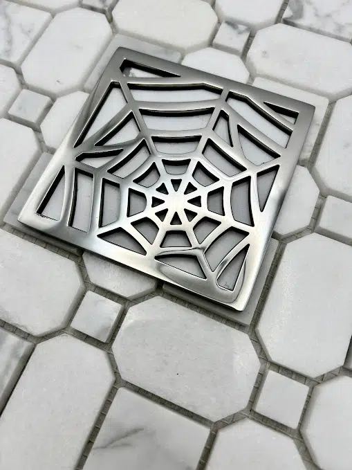 Designer Drains replacements for EBBE drains are specified by interior designers and architects worldwide. Our beautiful Spiderweb are shower drain covers that tie in your bathrooms ornamentation, theme and bring an attention to detail that give your shower a luxurious finish that is not found in any other shower drains. Our Designer Drains are easy to install & maintain, because they are made of stainless steel they will never rust, tarnish or fade and can hold over 1,000 pounds and are backed by our Lifetime Warranty. Our EBBE replacement square drain covers are available in the following finishes polished & brushed stainless steel, oil rubbed bronze, polished brass and brushed brass.